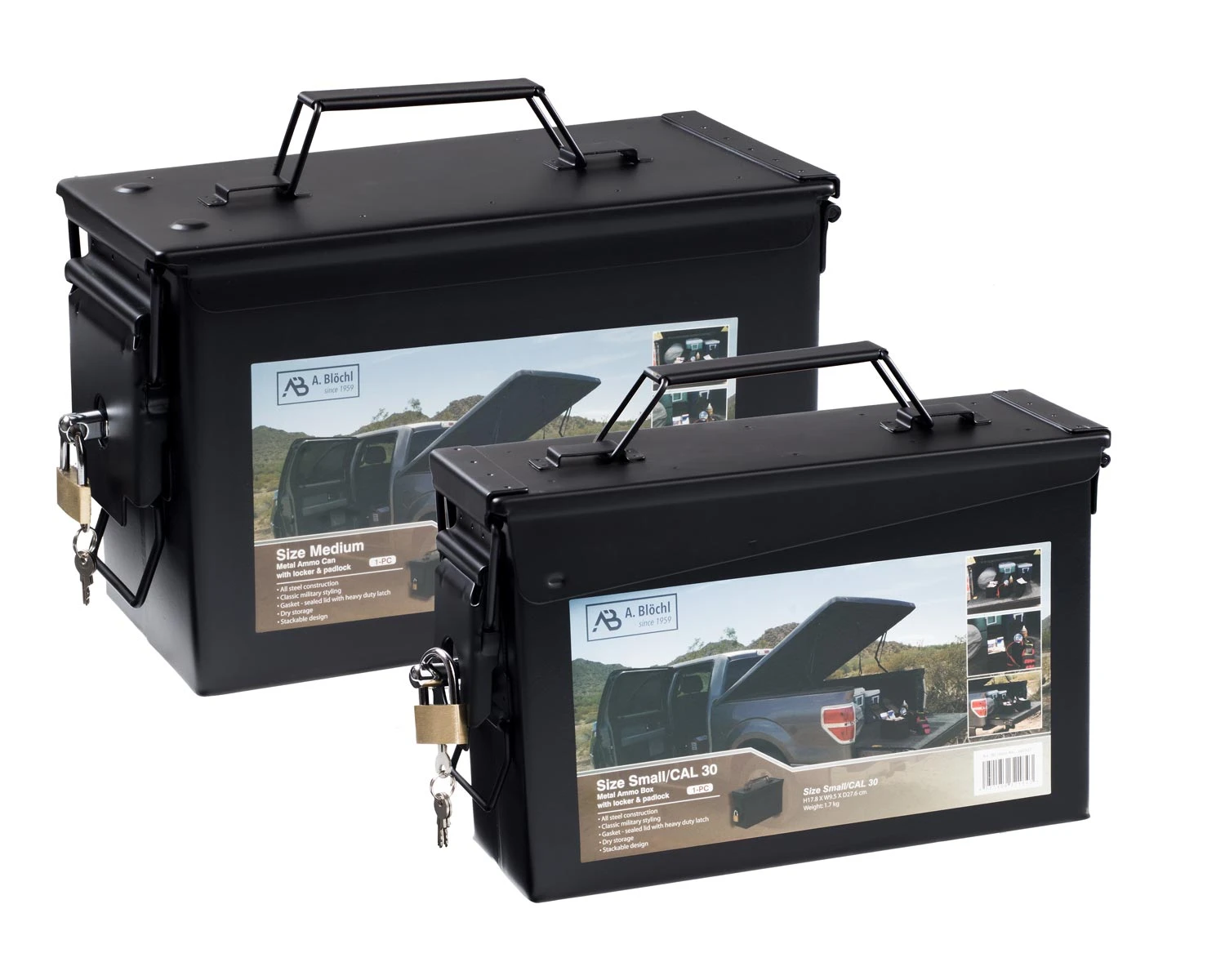 Das 2er Munitionskisten Set Metall besteht aus jeweils einer abschließbaren US Kiste in der Größe 1 und 2. Die Kisten sind über jeweils ein mitgeliefertes Vorhängeschloss abschließbar. Eine Gummidichtung im Deckel schliesst die Boxen wasserdicht ab. Die Kisten sind so gefertigt, dass mehrere Kisten auch übereinander gestappelt werden können. Zudem kann die Grösse 1 in der Kiste Grösse 2 verstaut werden. Die Munitionskiste in Grösse 2 für Cal. 50 und hat eine Gesamtgrösse von 30x19x16cm. Die Munitionskiste in Grösse 1 für Cal. 30 und hat eine Gesamtgrösse von 27,6x18x10cm. Die komplett aus Metall gefertigten Kisten sind auch zum Transport von sehr schweren Gegenständen geeignet und können über den seitlichen Henkel oder dem klappbaren Tragegriff oben transportiert werden.