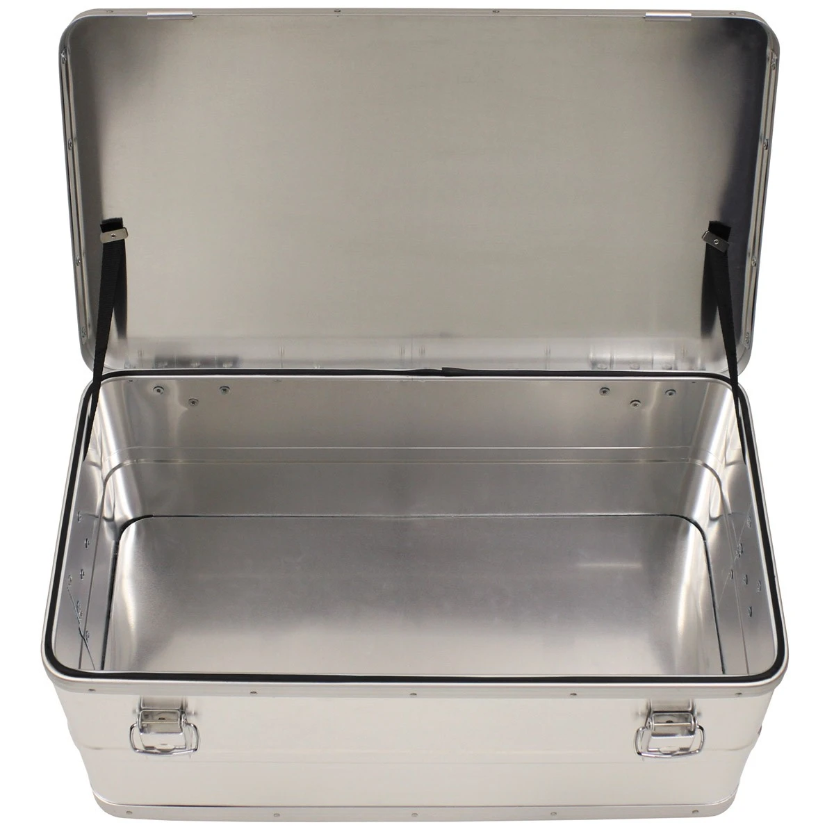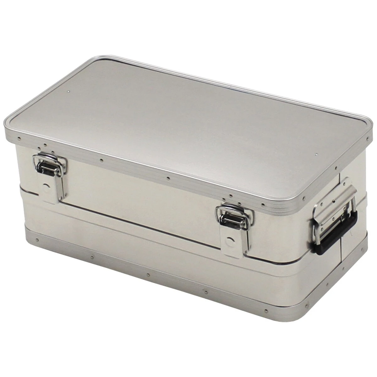 Die Alu Tranportkiste von MFH ist eine preiswerte und universell einsetzbare Aluminium Stapelbox mit einem Volumen von 34 L. Die Transport- oder Lagerbox hat eine umlaufende Versteifungssicke zur Wand und Eckenverstärkung. Ausserdem sind der Deckel- und Bodenrand der Alubox verstärkt um auch schweren Inhalt sicher transportieren zu können. Die beiden Verschlüsse sind per Vorhängeschlösser (nicht im Lieferumfang) abschzliessbar. Für den Transport sind 2 kunststoffverstärkte Klappgriffe angebracht. Die Kisten sind dank Gummidichtung regendicht.