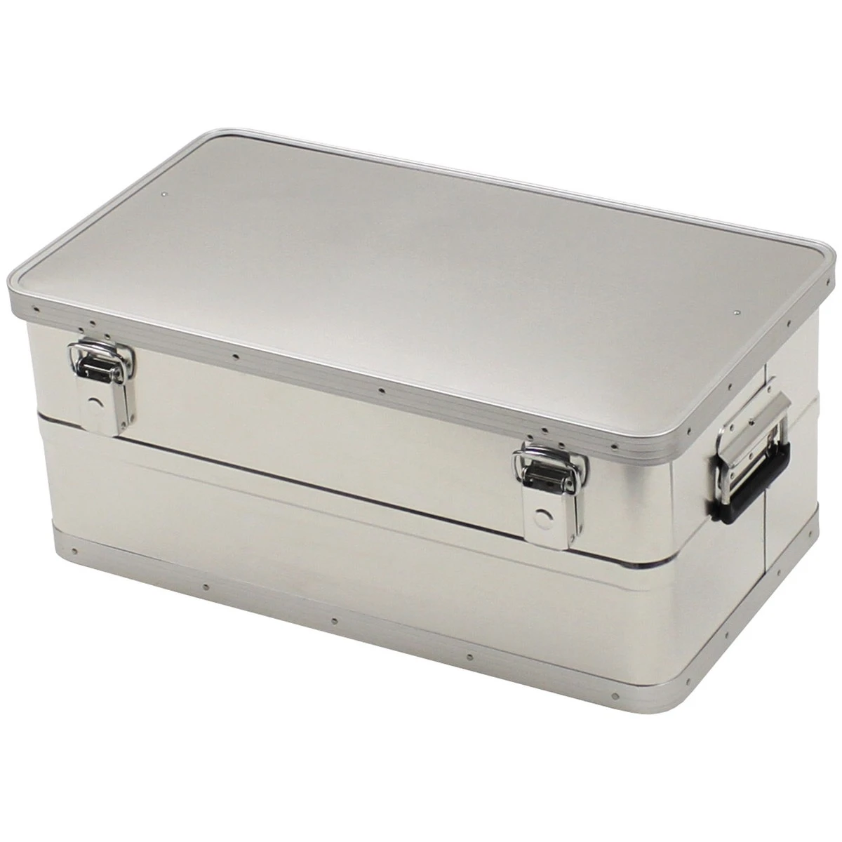 Die Alu Tranportkiste von MFH ist eine preiswerte und universell einsetzbare Aluminium Stapelbox mit einem Volumen von 55 L. Die Transport- oder Lagerbox hat eine umlaufende Versteifungssicke zur Wand und Eckenverstärkung. Ausserdem sind der Deckel- und Bodenrand der Alubox verstärkt um auch schweren Inhalt sicher transportieren zu können. Die beiden Verschlüsse sind per Vorhängeschlösser (nicht im Lieferumfang) abschliessbar. Für den Transport sind 2 kunststoffverstärkte Klappgriffe angebracht. Die Kisten sind dank Gummidichtung regendicht.