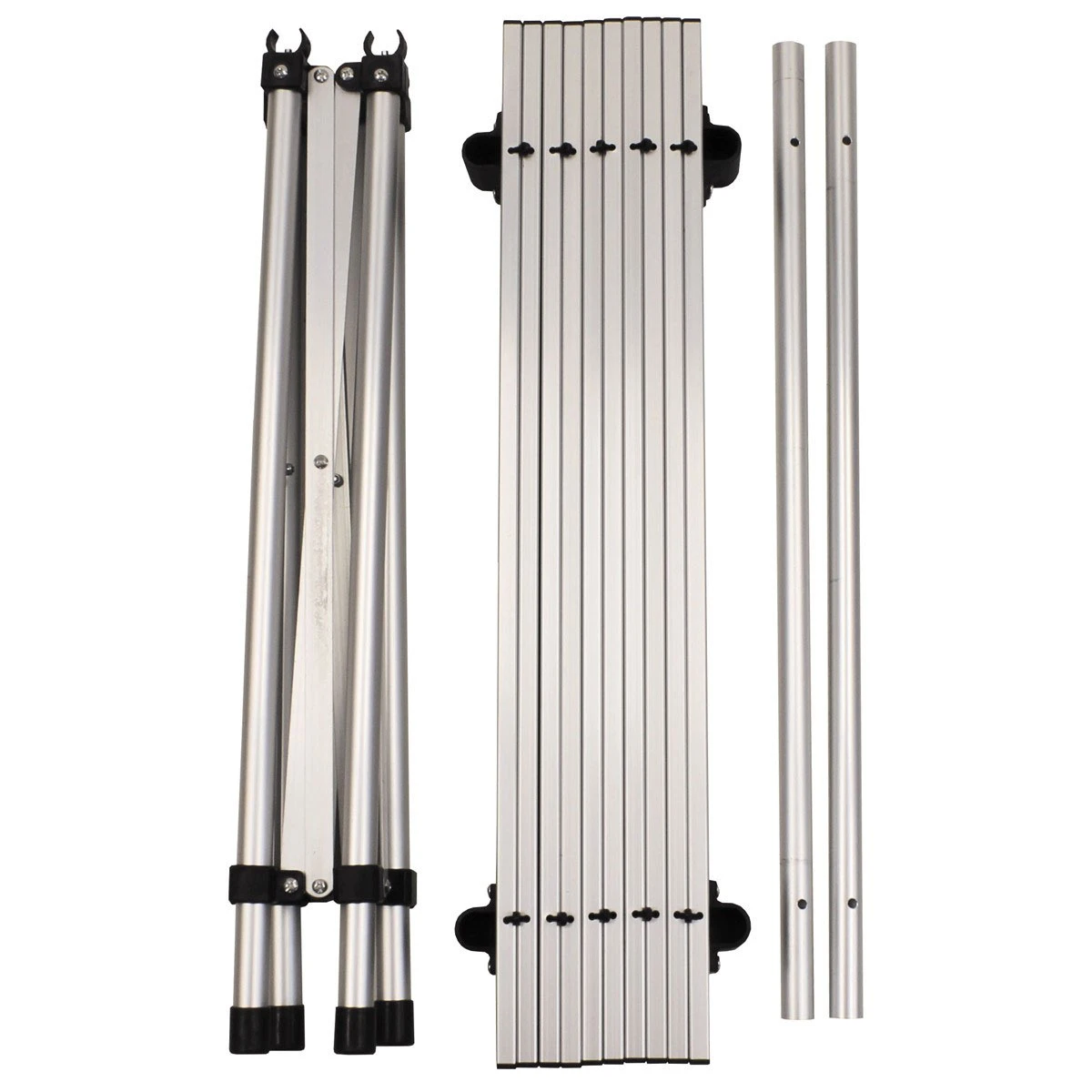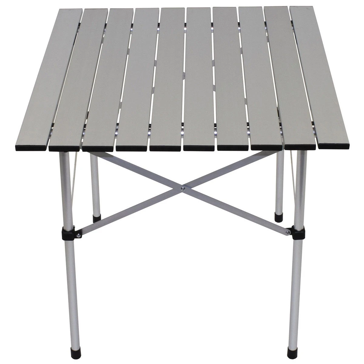 Der platzsparende Rolltisch aus Aluminium, der meist auf Camping-Plätzen als Campingtisch oder Zuhause als Beistelltisch bei Partys aufgebaut wird. Der Tisch besteht aus einem aufklappbarem Gestell und einer aufrollbaren Tischplatte, die dann per Clicksystem zusammen geklickt werden. Die Tischplatte (58x58cm) besteht aus per Gummizug verbundene Alu-Lamellen, die sich schnell Auf- bzw. Ausrollen lassen. Die extraflachen Scheren des Tragegestells sorgen für maximale Beinfreiheit bei dennoch hervorragender Stabilität.
