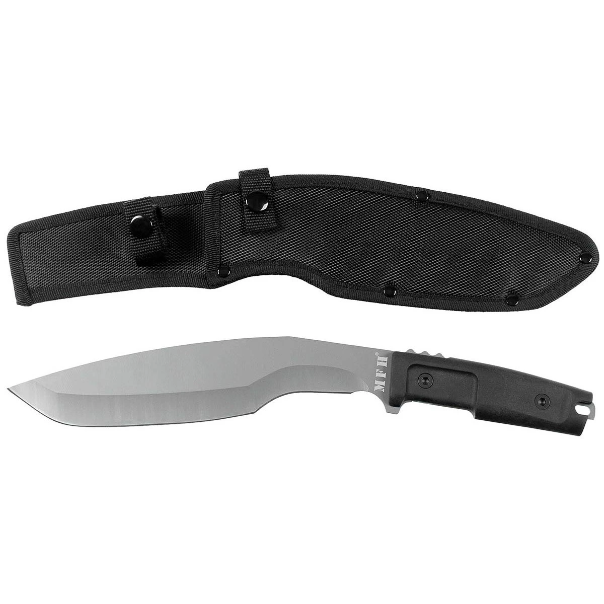 Das Buschmesser Kukri von MFH mit Edelstahl-Klinge, Glattschliff und Titan-Beschichtung. Inspiriert ist das Buschmesser vom Kukri, einem klassischen Haumesser nepalesischen Ursprungs, welche vor allem durch die britischen Gurkha-Einheiten bekannt wurde. Die Allround-Machete mit rutschfestem Gummigriff, gerillter Daumenauflage und einer Fangöse am Griffende hat eine Gesamtlänge von 37cm. Die leicht gebogene Baumform hilft beim Schlagen durch dichtes Gehölz oder Sumpfgras. Die Nylonscheide mit Druckknopf und Gürtelschlaufe verstaut das Buschmesser sicher.