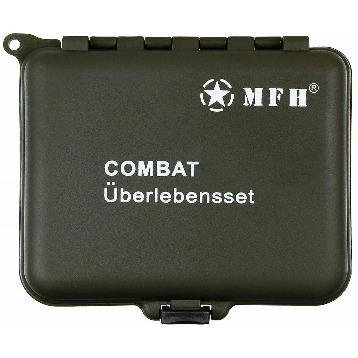 Mit dem Combat Überlebensset erhalten Sie alle wichtigen Produkte, die fürs Überleben in der Wildnis notwendig sind. Die Survival Box beinhaltet neben Feuerstarter und Messer viele weitere nützliche Utensilien.
