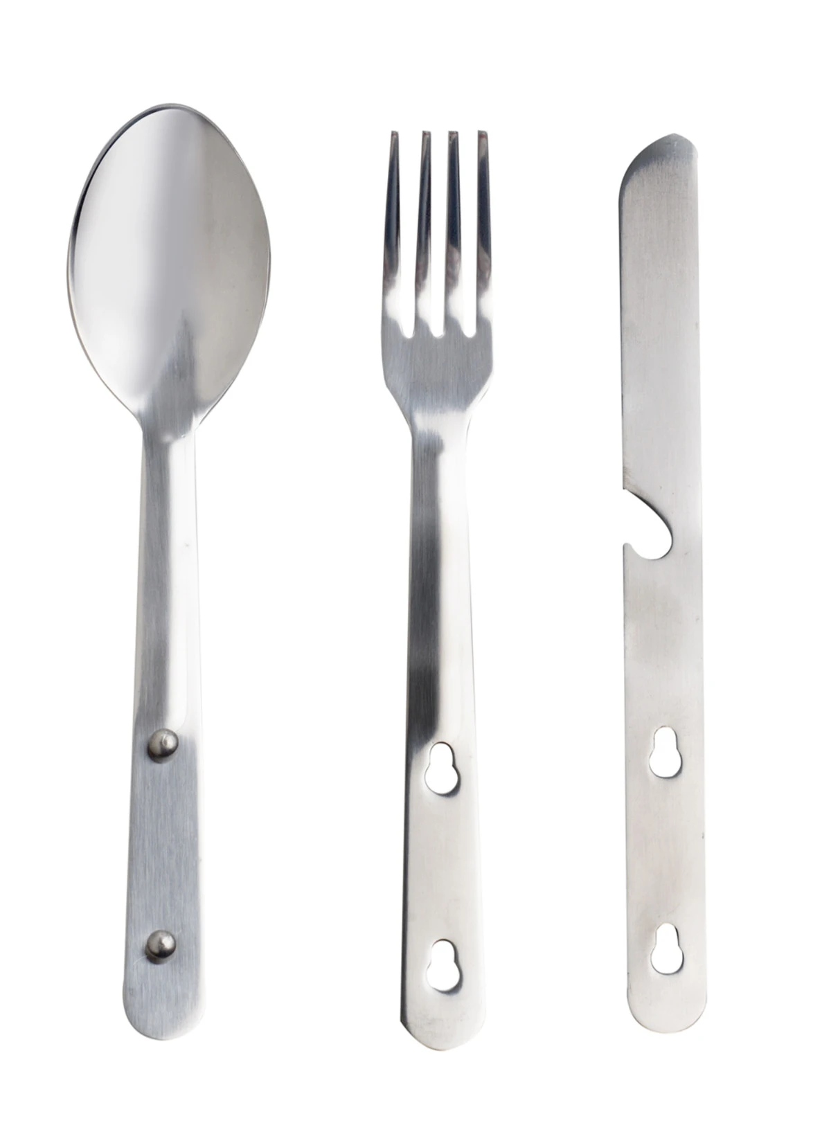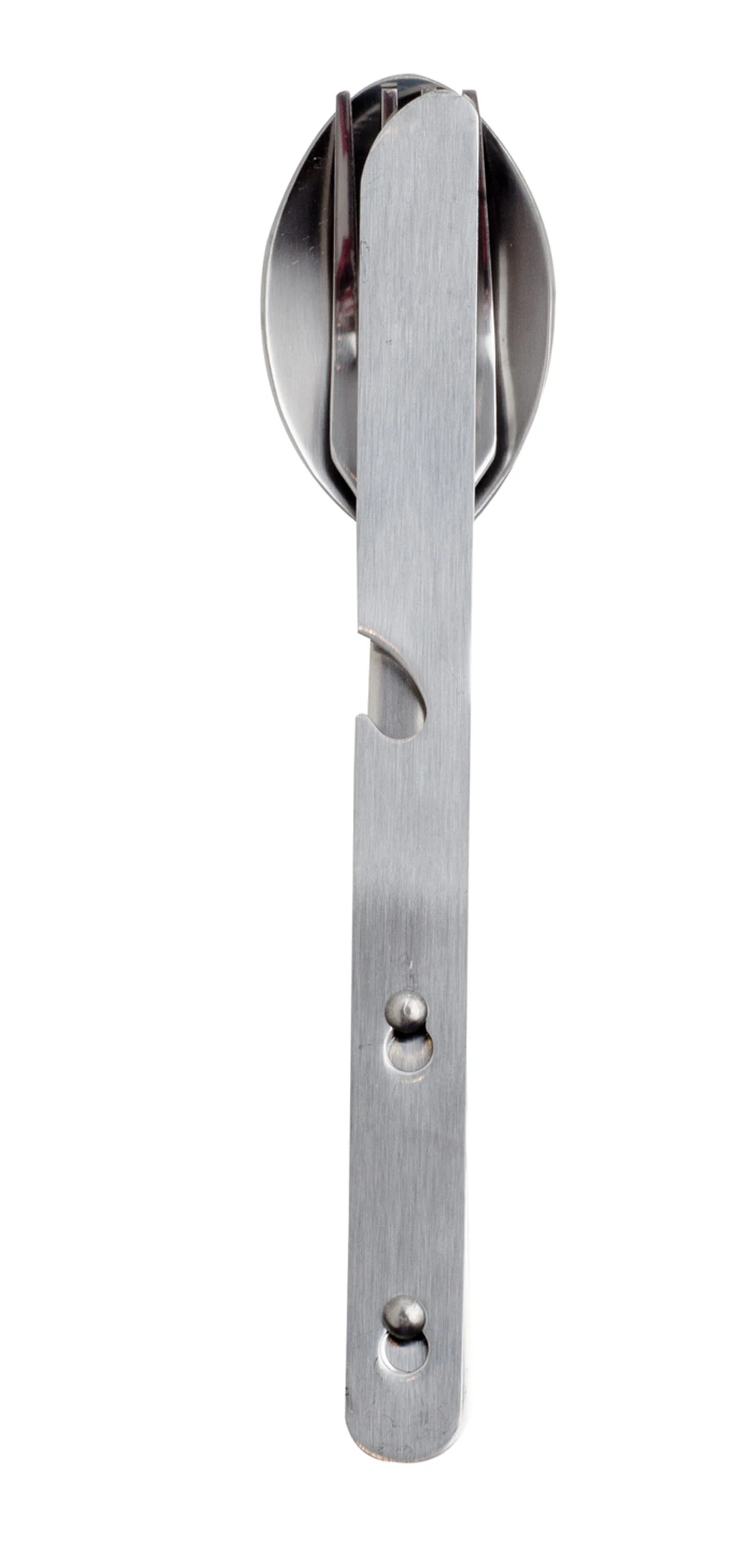 Günstiges Einsteiger Camping Essbesteck bestehend aus Messer, Gabel und Löffel. Messer und Gabel können über die Öffnungen platzsparend auf den Löffel gesteckt werden.