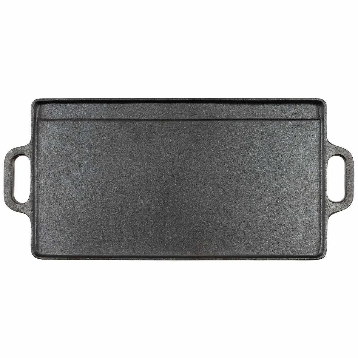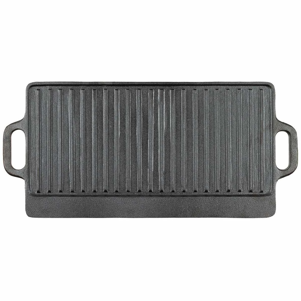 Mit der Fox Outdoor Wende Grillplatte aus Gusseisen grillen sie schmackhafter und gesünder. Die Grill Wendeplatte mit einer Größe von 50 x 23 x 1,5 cm hat 2 verschiedene Seiten (flach und gerillt). Die Seite mit Rillen ist perfekt zum fettarmen Grillen von Steaks, Würstchen oder leckerem Spieß. Die flache Seite ist optimal für Pfannkuchen, Spiegeleier, Fisch oder sogar für Pizza geeignet. Gusseisen hat den großen Vorteil, dass die Hitze hervorragend gespeichert wird und so auch Temperaturunteschiede am Grill oder Feuer optimal ausgeglichen werden. Die Grillplatte hat einen umlaufenden Rand, so dass kein Öl oder Fett ins Feuer tropft und dadurch keine giftigen Stoffe verdampfen.