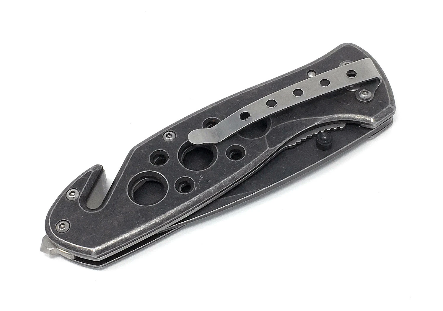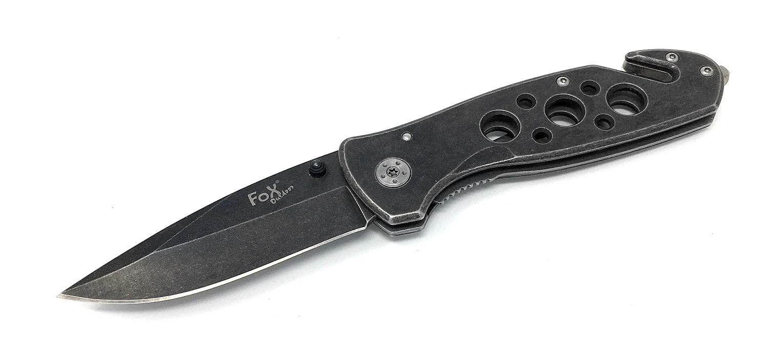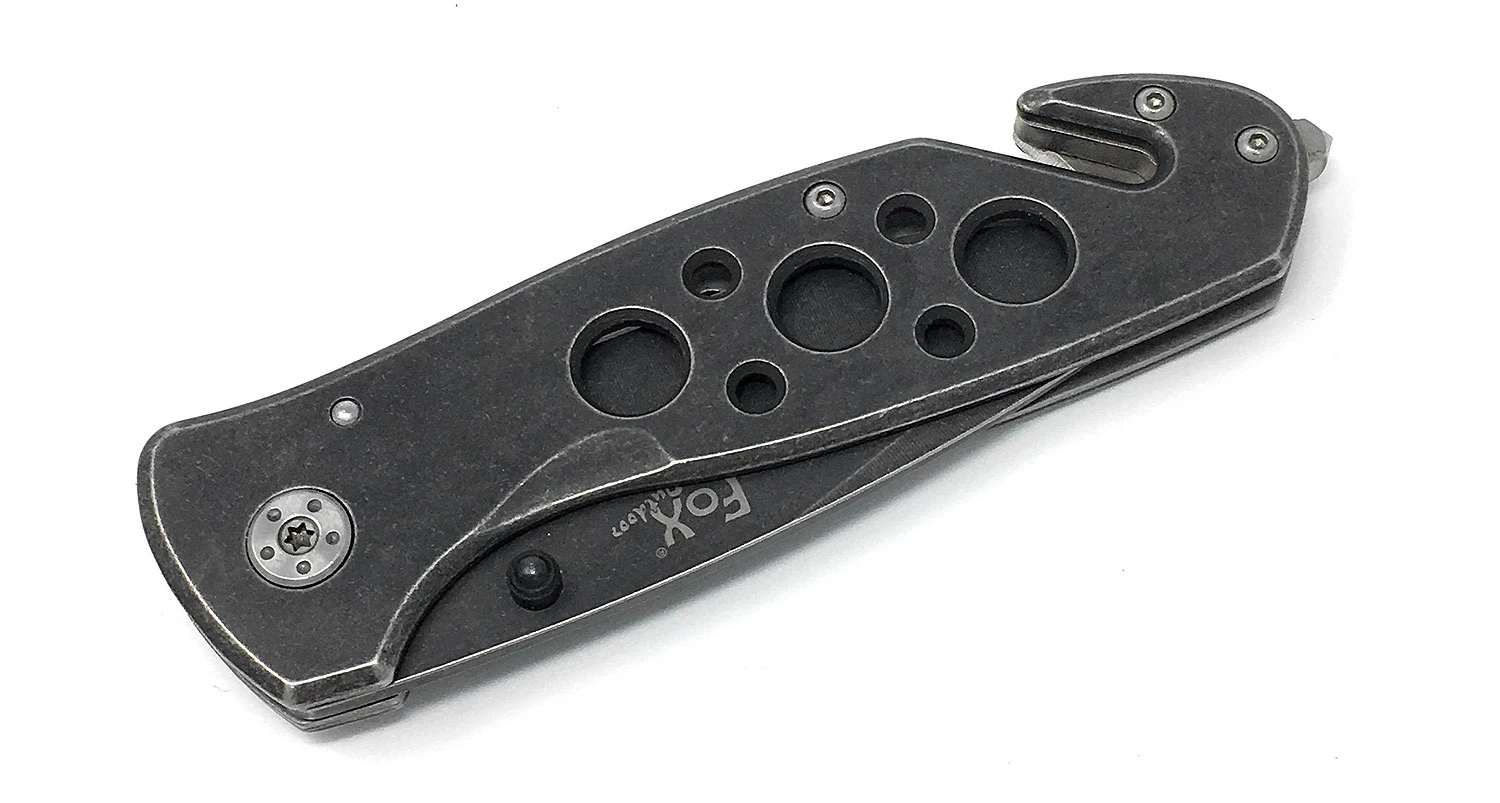 FOX Outdoor Taschenmesser mit Gurtschneider und Glasbrecher. Der gelochte Griff in stonewashed ist ein optisches Highlight und spart zudem Gewicht.