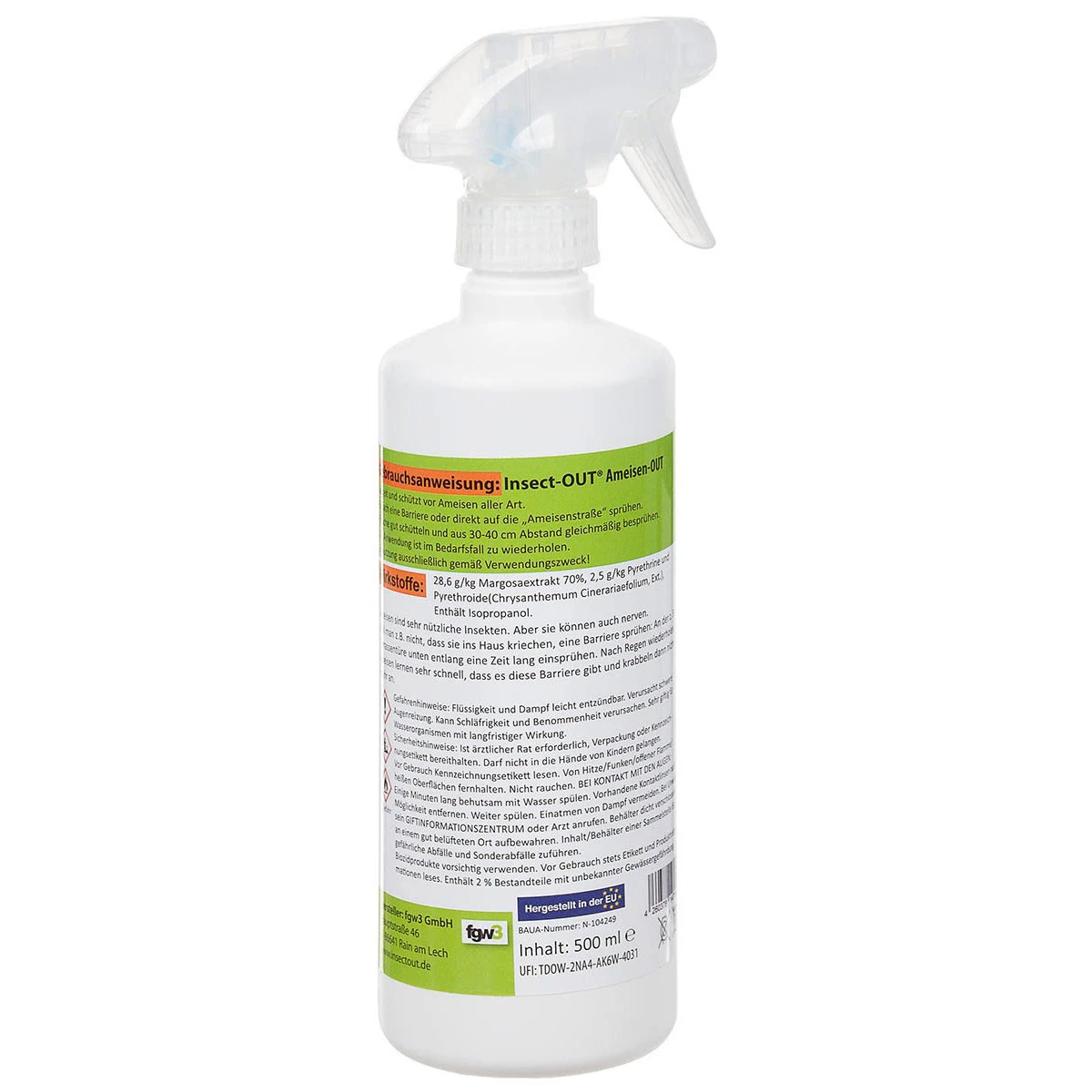 Das Insect-Out Ameisen Spray 500ml schützt vor Ameisen aller Art. Das Anti-Ameisenspray mit den Wirkstoffen des Neembaumes und der Chrysantheme vertreibt Ameisen im Innen- und Außenbereich sofort. Die Anwendung ist denkbar einfach. Kurz schütteln und das Spray aus ca. 30-40cm Abstand als „Barriere“ oder direkt auf dei Amseisenstraße sprühen. Die Ameisen lernen sehr schnell, dass es diese Barriere gibt und meiden zukünftig diesen Bereich.