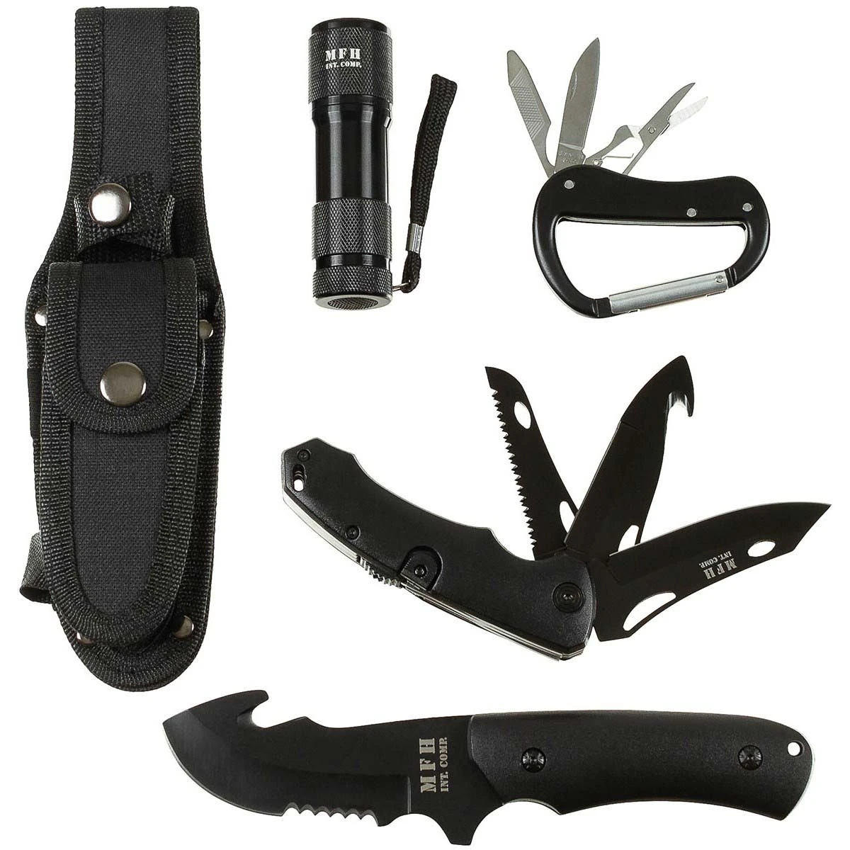 Das große Survival Messerset von MFH mit feststehendem Messer, Multitoo, Taschenlampe und Karabiner. Dieses Überlebensset sollte bei keiner Mehrtagestour fehlen.