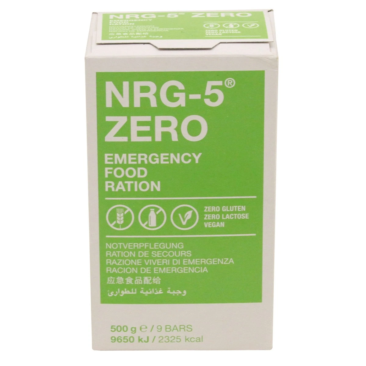 Das Notfall-Nahrungsmittel wird bei Nahrungsengpässen und Katastrophen auf der ganzen Welt eingesetzt. Durch nahezu unschlagbare Kaloriendichte reichen bereits 4 Riegel für den Tagesbedarf eines Erwachsenen. Eine 500 Gramm Packung enthält 9 Riegel mit einem speziellen Verhältnis von Protein, Fett, Kohlenhydrate sowie Vitaminen und Mineralstoffen. NRG-5 Zero ist sofort und ohne Zubereitung zu geniessen. Ideal auch als Expeditionsnahrung. Eine 500g Packung sorgt für eine Energiezufuhr von 9650 kJ/2325kcal.