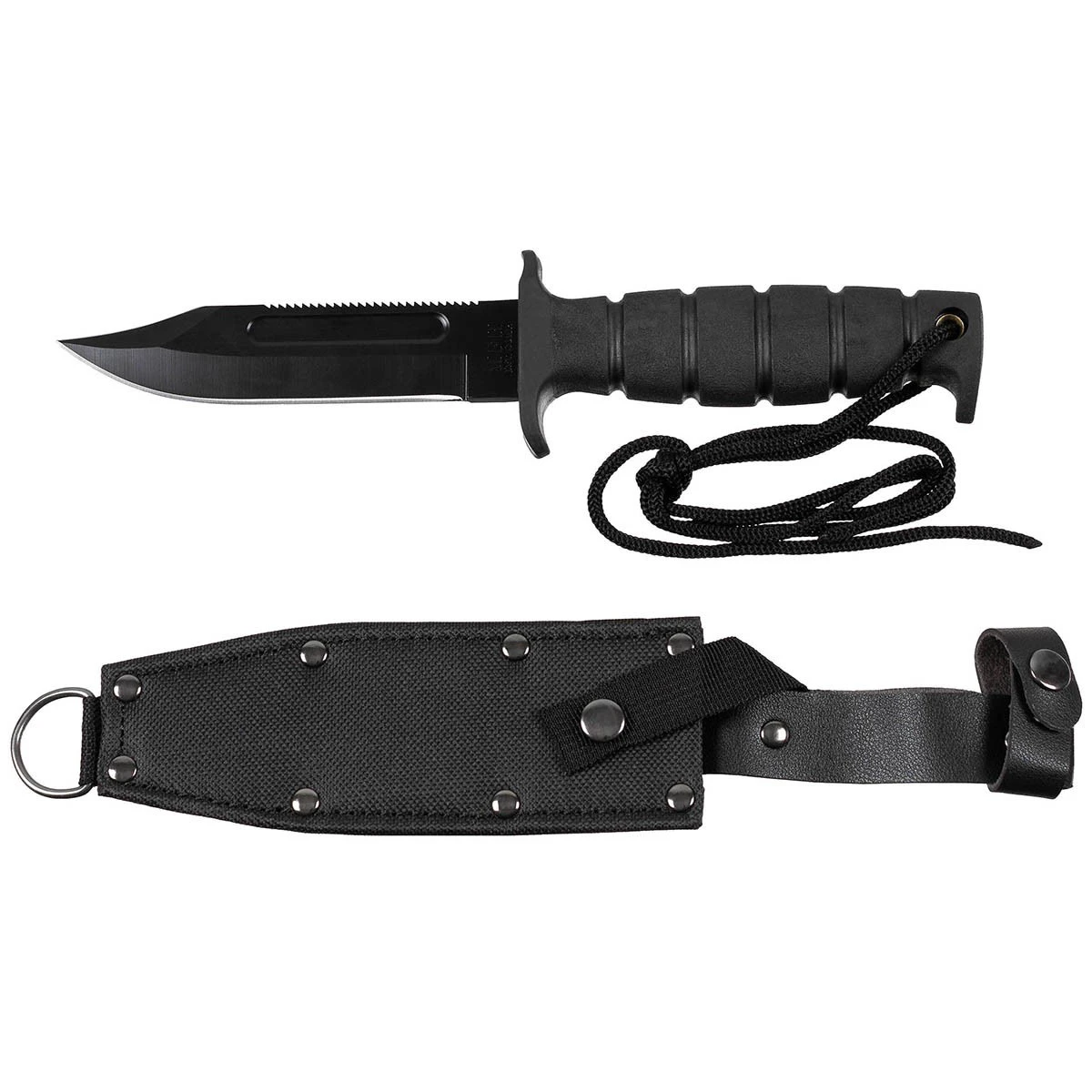 Pilotenmesser von MFH mit Nylon/Leder Scheide. Durch ein zusätzliches Band am Holster kann die Scheide am Oberschenkel fixiert werden.