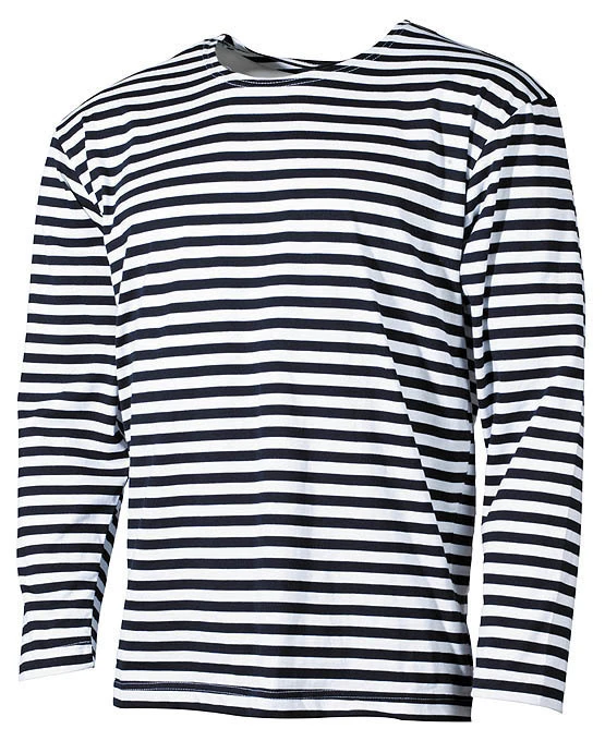 Russisches Marine Streifen Longsleeve aus 100% Baumwolle. Das Langarmshirt ist marineblau (fast schwarz) mit weiß gestreift. Das Streifenshirt ist mit Rundhals-Ausschnitt und angenehm gerade geschnitten. Der Ringelshirt-Klassiker kann Solo oder modisch unter der Jacke oder sogar Sakko getragen werden.
