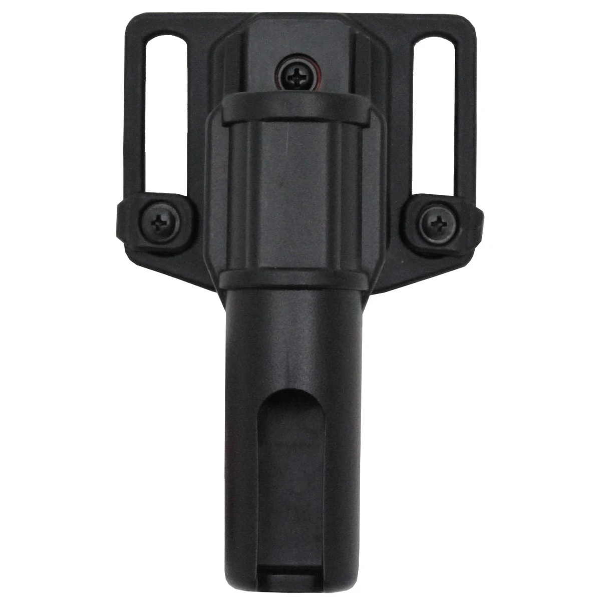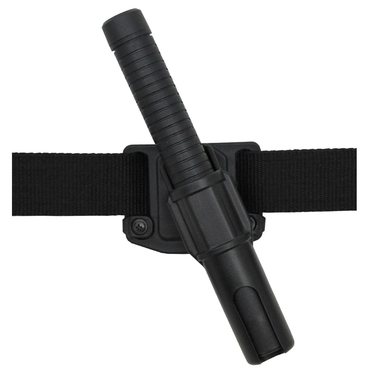Der Schlagstockhalter ist um 360° drehbar und in 16 Position arretierbar. Die offene Konstruktion ermöglicht einen schnellen Zugriff auf den Schlagstock. Die Halterung kann für Gürtel oder Koppel bis 5cm Breite eingesetzt werden.