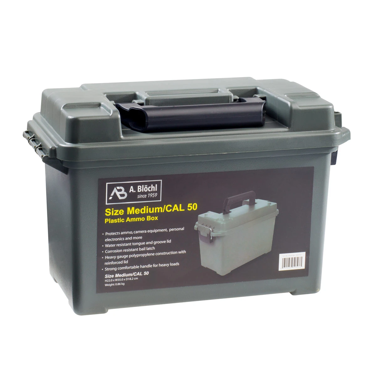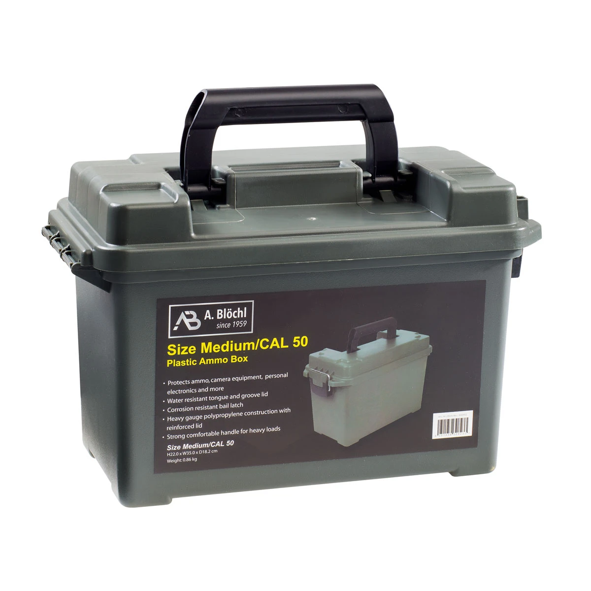 Die US Munitionskiste Medium CAL 50 in der Grösse 35x22x18,5 cm ist eine praktische Aufbewahrungs- und Transportbox aus schlagfestem Kunststoff. Der Schnappverschluss schließt die Box effektiv und wasserdicht ab. Ein ergnonomisch geformter Tragegriff sorgt für angenehmen Transport auch bei schweren Lasten. Die Kiste in der Größe CAL 50 wird sehr gerne von Air Soft Spielern verwendet. Aber auch als Werkzeugbox oder sonstige Aufbewahrungsbox ist die Kiste hervorragend geeignet. Die stabelbare Box ist durch bereits eingearbeitete Ösen durch ein Vorhängeschloss (nicht im Lieferumfang) abschließbar.