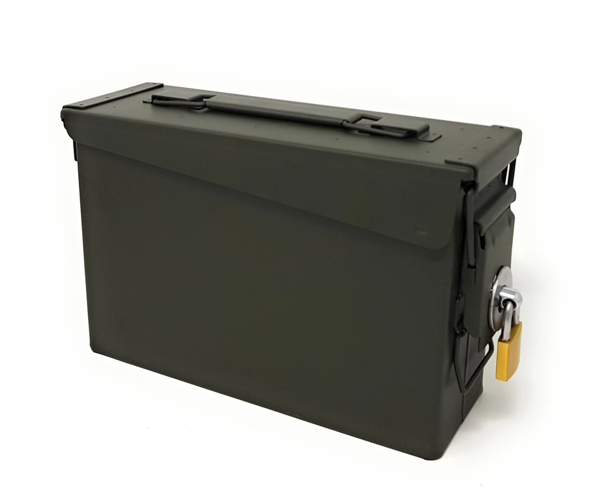 Die Munitionskiste Metall in Größe 1 der US Army ist über ein mitgeliefertes Vorhängeschloss abschließbar. Eine Gummidichtung im Deckel schliesst die Box wasserdicht ab. Die Kisten sind so gefertigt, dass mehrere Kisten auch übereinander gestappelt werden können. Die Munitionskiste ist in Grösse 1 für Cal. 30 und hat eine Gesamtgrösse von 27,6x18x10cm. Die komplett aus Metall gefertigte Kiste ist auch zum Transport von sehr schweren Gegenständen geeignet kann über den seitlichen Henkel oder dem klappbaren Tragegriff oben transportiert werden.